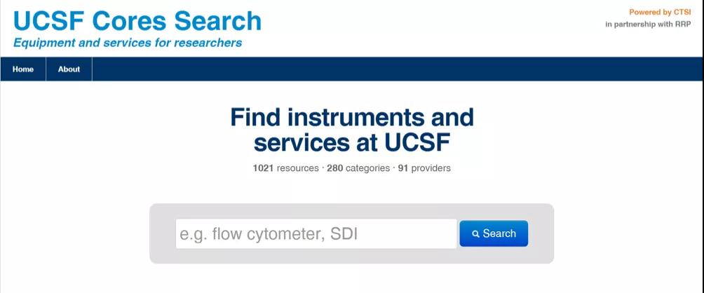 加州大学旧金山分校研究设施检索平台UCSF Cores Search(https://cores.ucsf.edu/),平台集聚280个类别1021个设备及服务资源。该平台由加州大学旧金山分校的研究资源计划(rrp)和临床与转化科学研究所(ctsi)开发,旨在帮助研究人员找到加州大学旧金山分校的共享资源和联系资源管理者。
